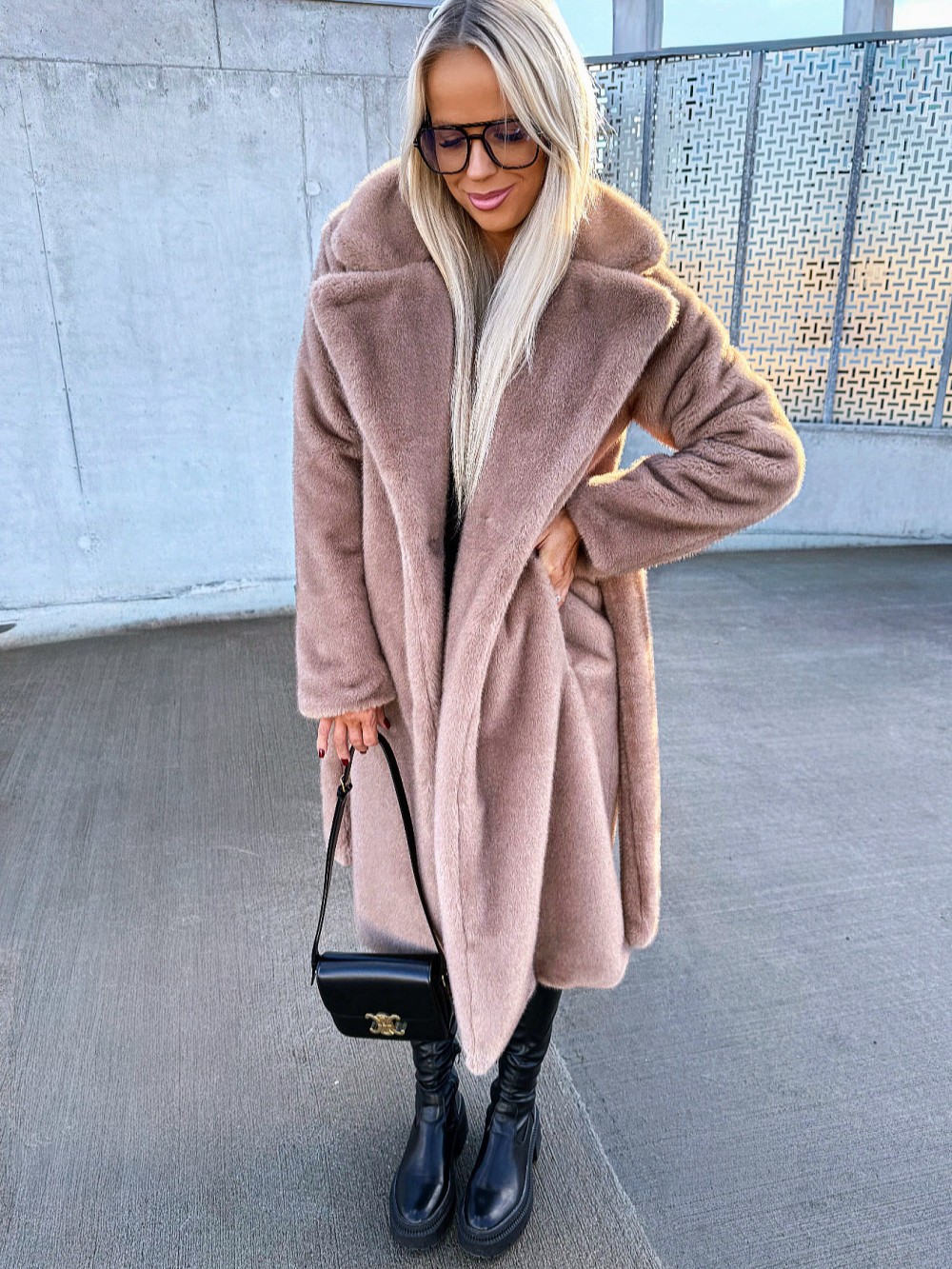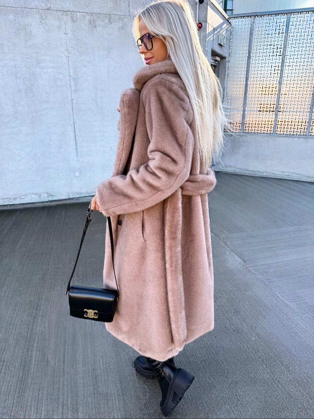 Prabangus žieminis paltas su surišimu priekyje (S/M, Šviesiai smėlio spalvos)