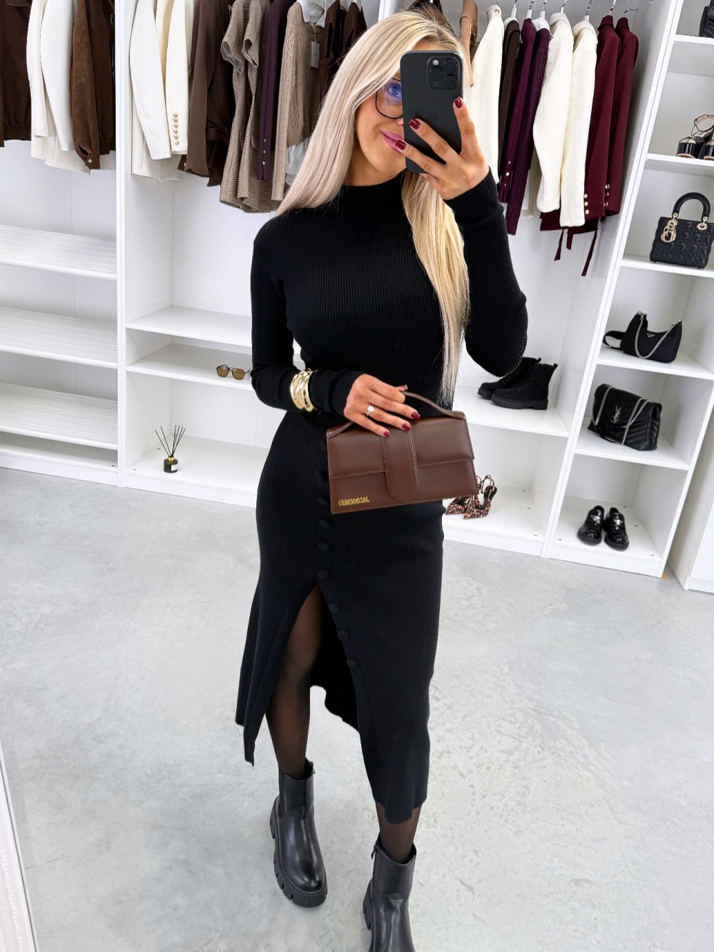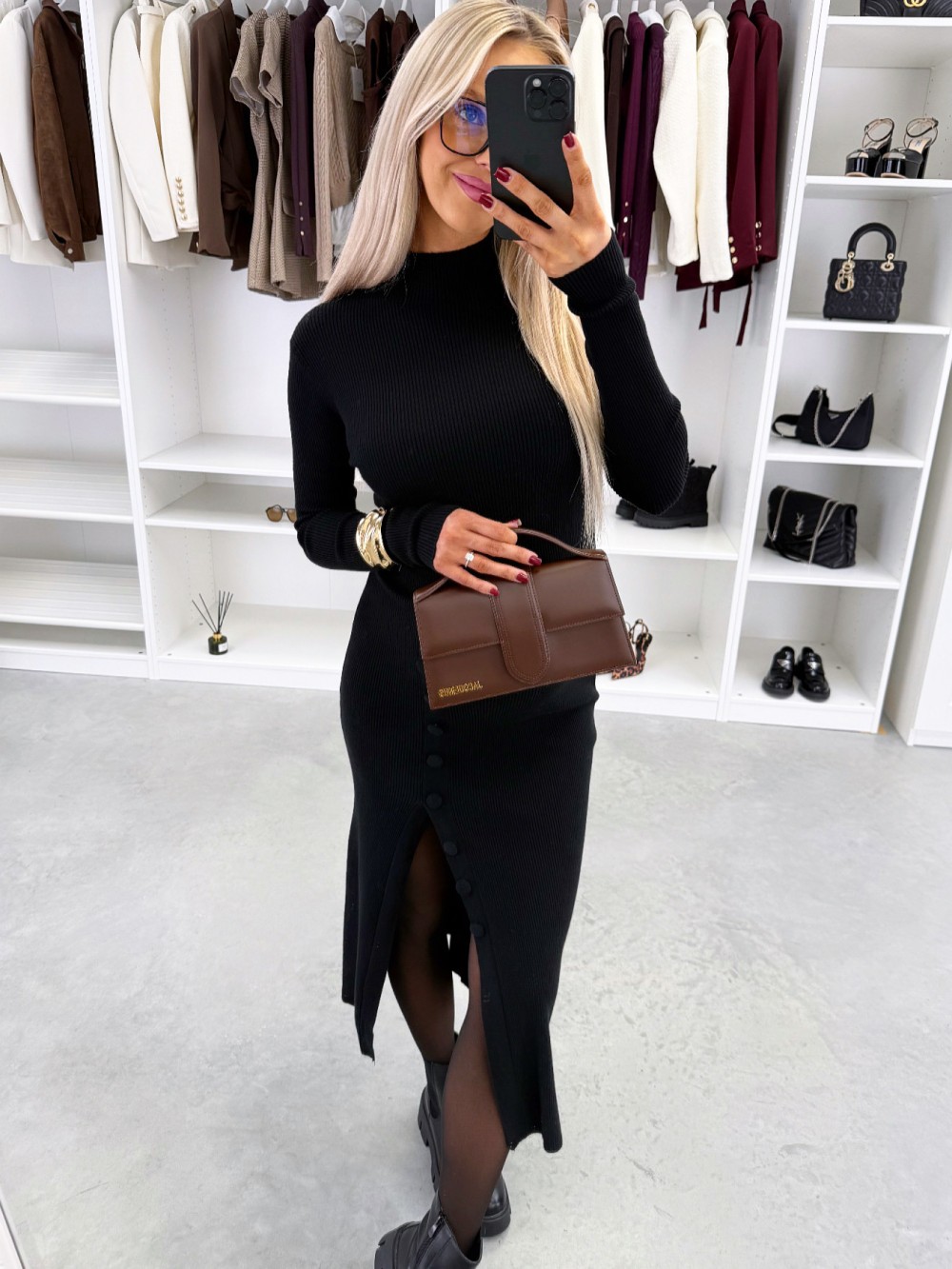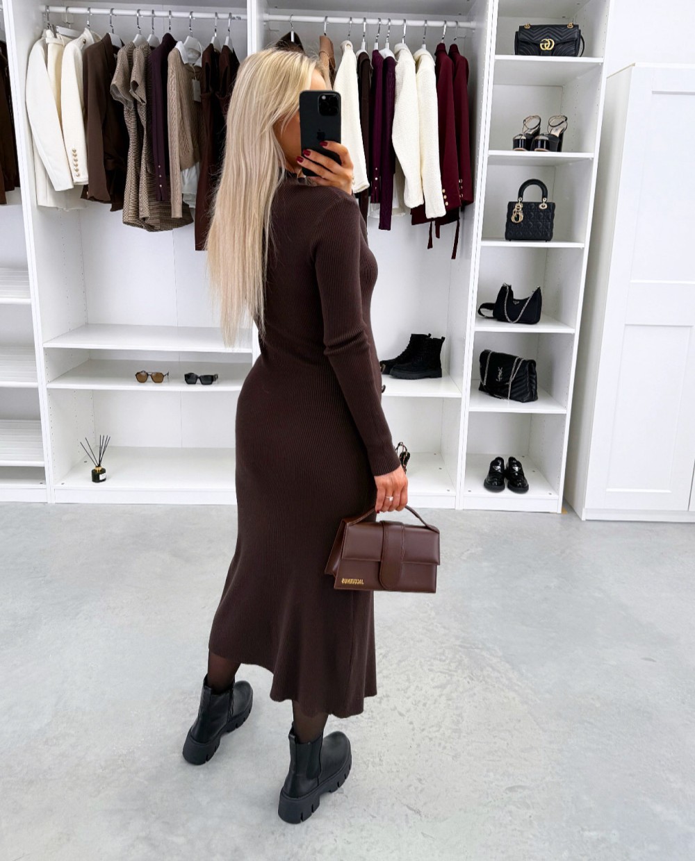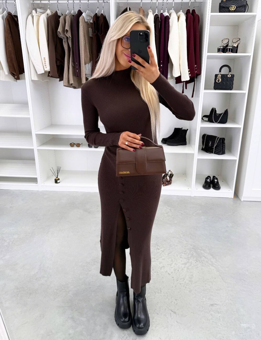 Платье-свитер из стрейч-трикотажа с разрезом сбоку (Один размер, Коричневый)